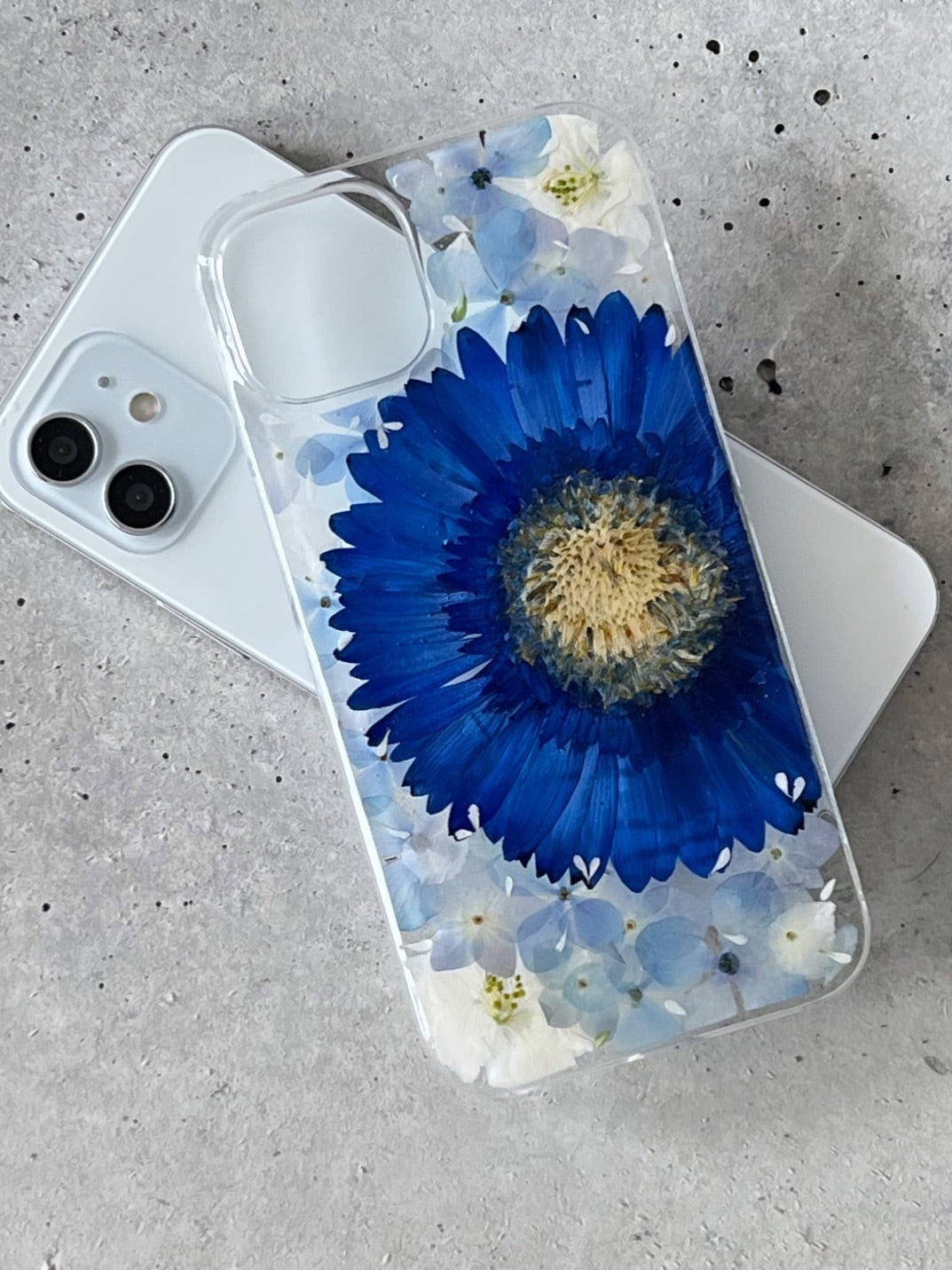 アジサイの優しさと、青いガーベラの凛とした美しさをスマホケースに閉じ込めた