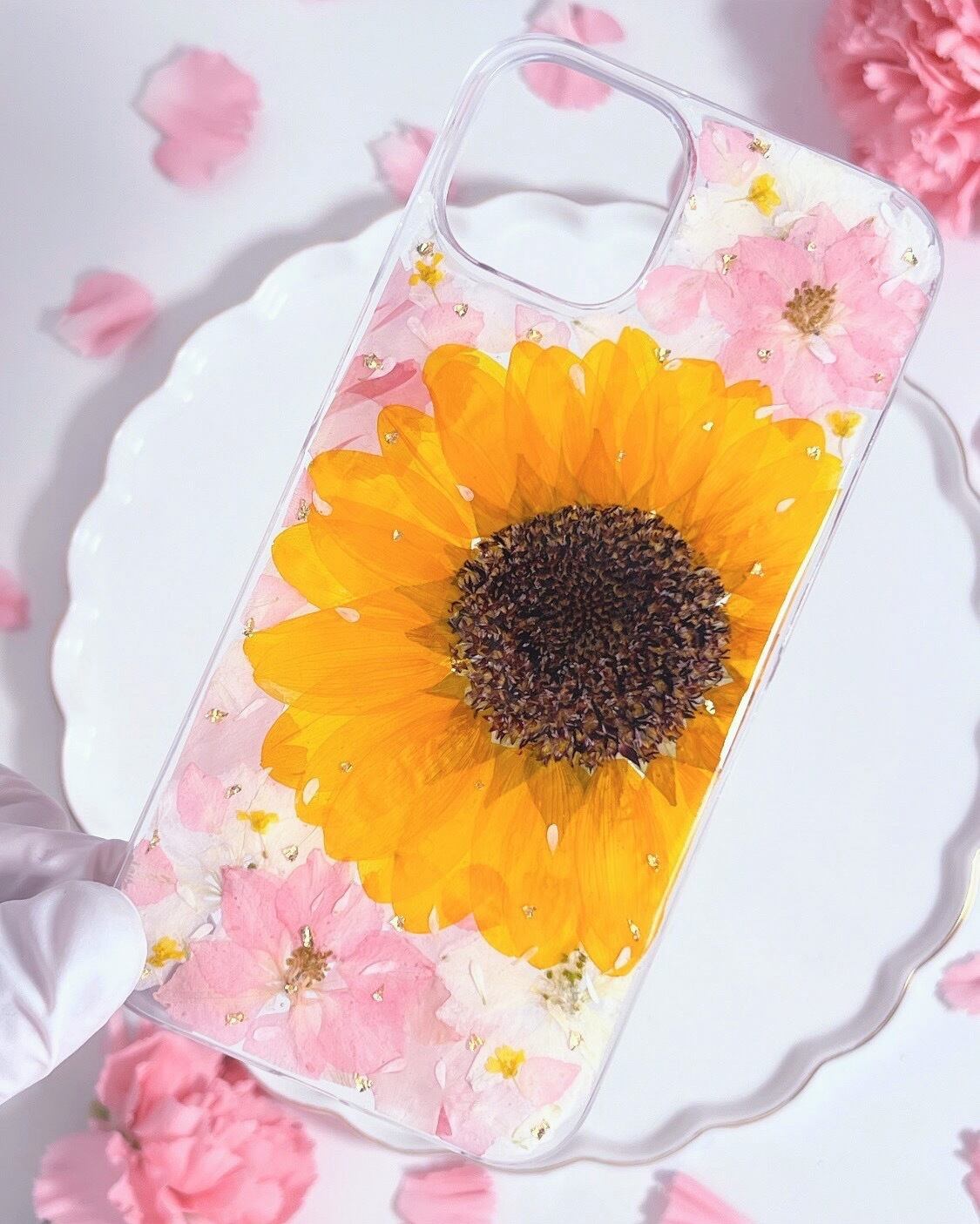 太陽のお花(ひまわり)の押し花スマホケース