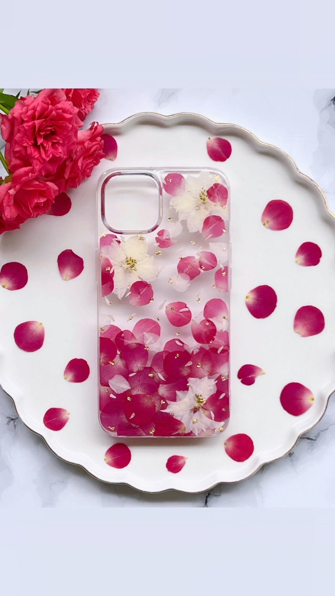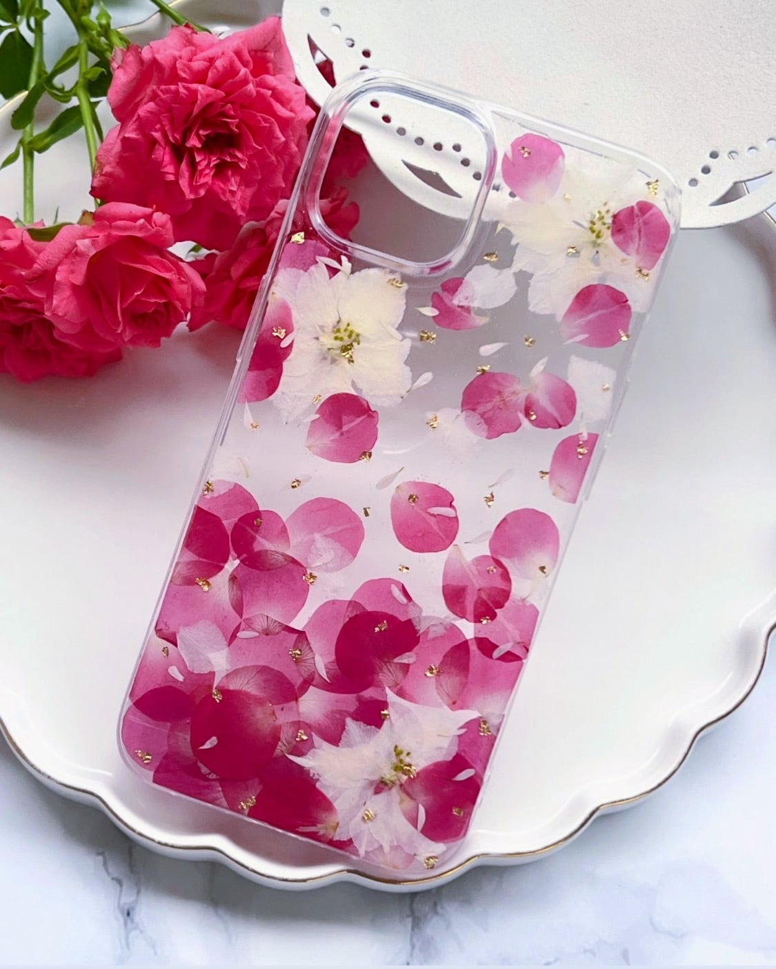 可憐なバラの花びらを一枚ずつ丁寧に押し花にして、透明感のあるスマホケースに閉じ込めました。