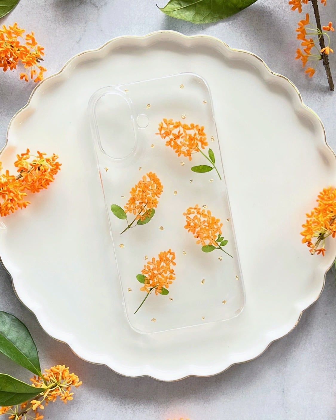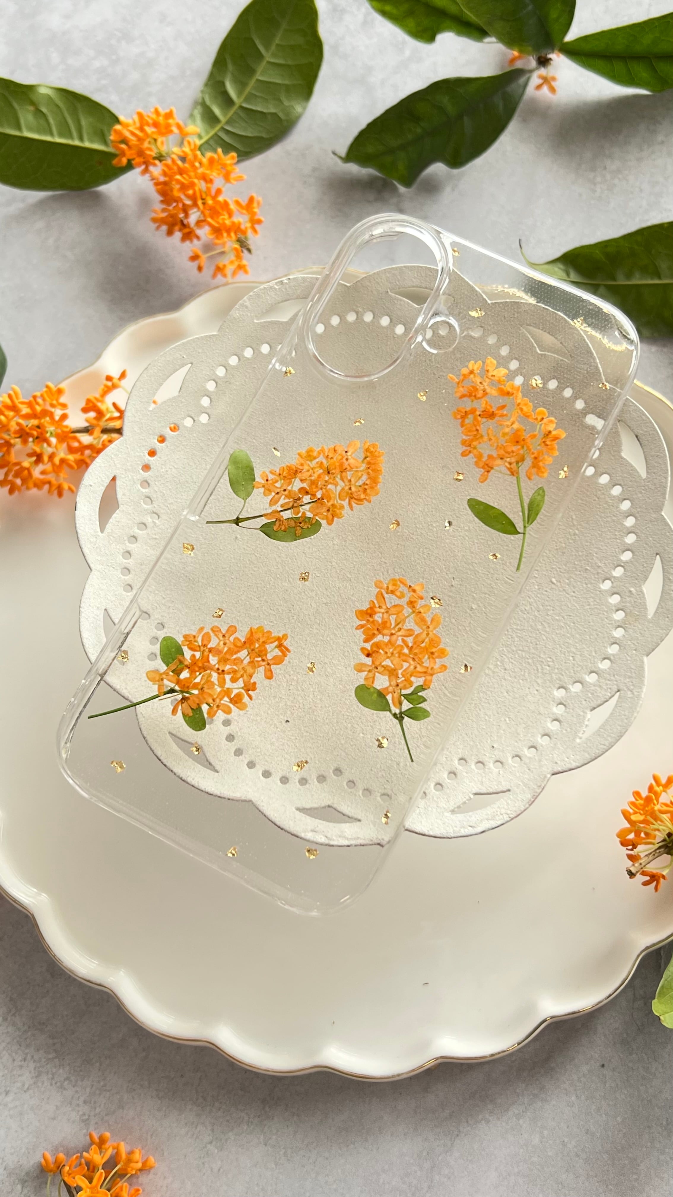 金木犀の押し花スマホケース《Natural》 — 秋の香りをそのまま閉じ込めて —