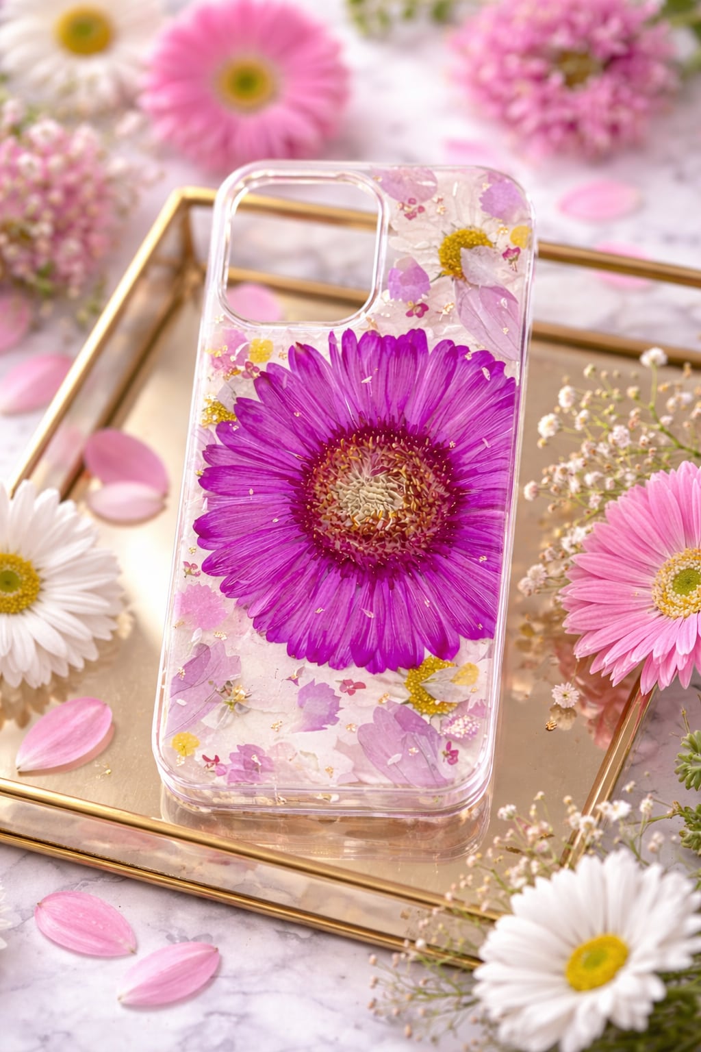 大切な想いを閉じ込めたような押し花スマホケースです。