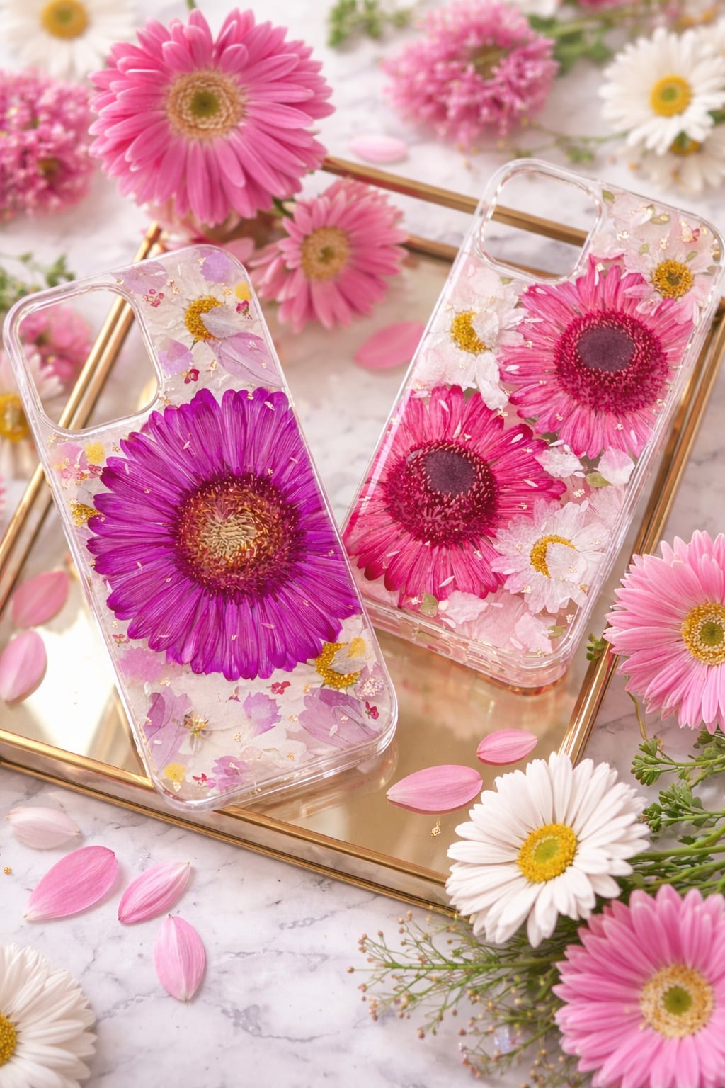 赤紫のガーベラ押し花スマホケース