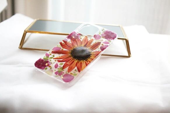 ブラッドレッドひまわりの押し花スマホケース